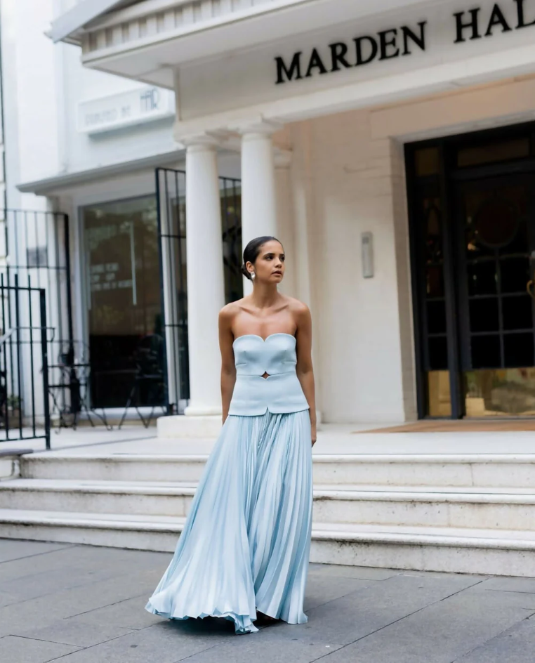 A fresh take on a classic Acler silhouette - the Avonlea Midi Dress in Celeste Blue features a modern bodice design, complimented with our signature pleated fabrication. Structured bodice with a square neckline compliments a free flowing skirt.