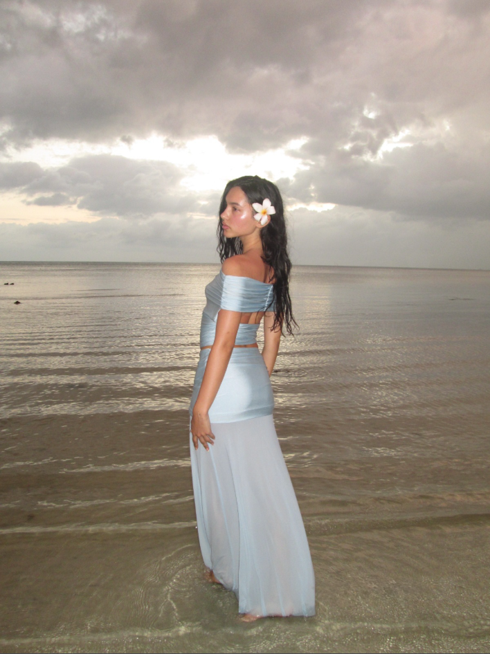 This skirt was crafted to sculpt a silhouette that is both flowy and elegant. Contrasting two fabrics, with a sheer mesh design, that's both flattering and glamorous. Designed in our ice blue colourway, this skirt allows you to move gracefully with stretch fabric.