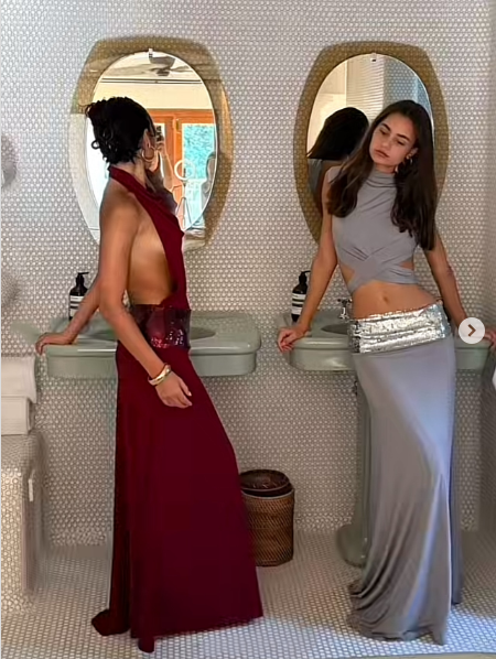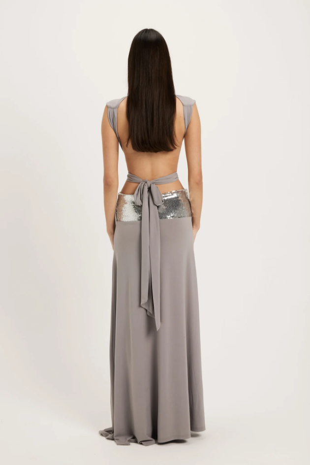 The Lune top showcases a high boat neckline and ruched ties that wrap and tie at the back, creating a beautiful backless silhouette. Crafted with stretch jersey for a comfortable fit. Paired beautifully with the Lune Skirt. This low waisted skirt features a shimmering sequined waistband adding textural definition, crafted with stretch sequins and lined with jersey for comfort. The fluted skirt drapes asymmetrically, designed to glide beautifully as you walk.