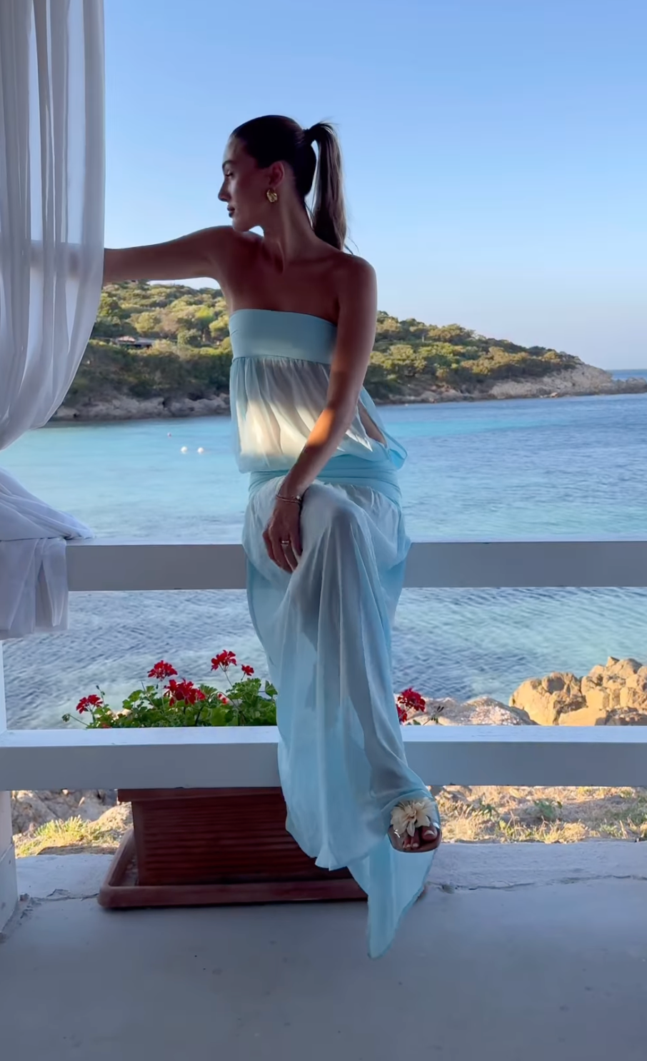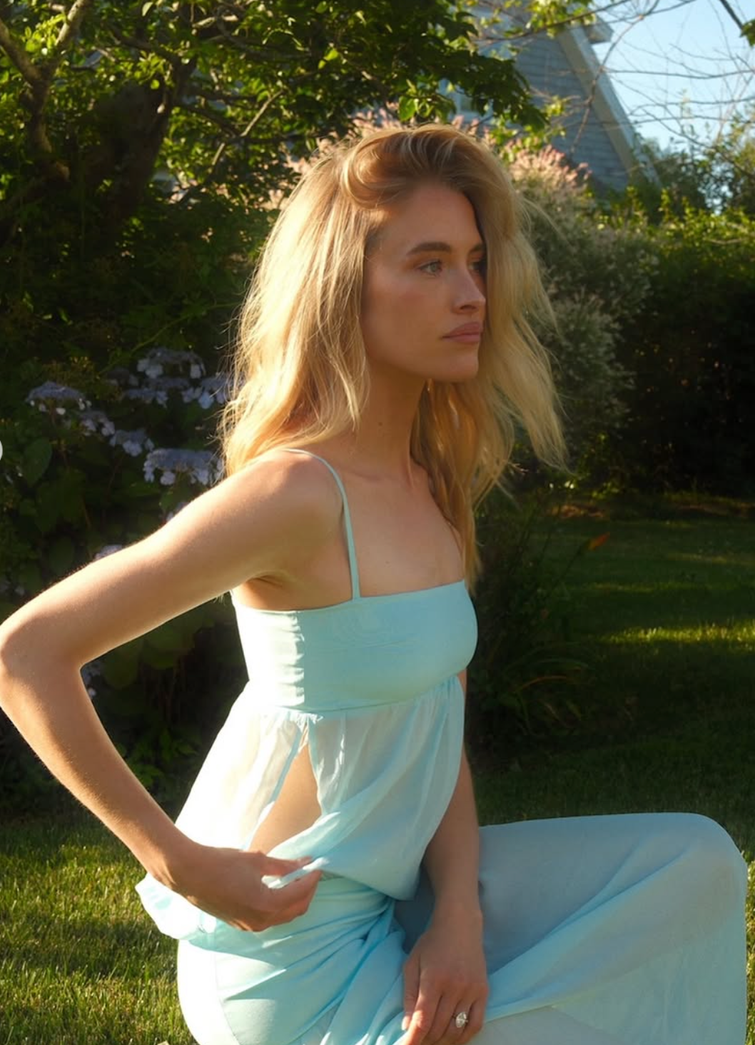 A dreamy blend of structure and softness, with a square neckline, delicate straps, and a fitted waistband flowing into a draped chiffon skirt. The lightweight fabric creates an elegant, fluted silhouette.