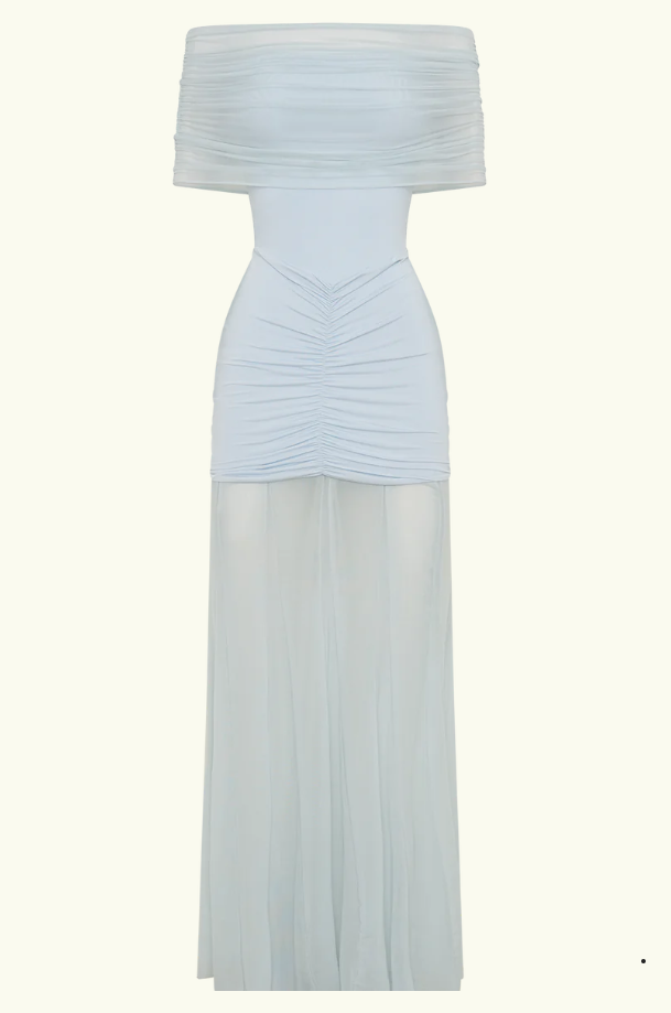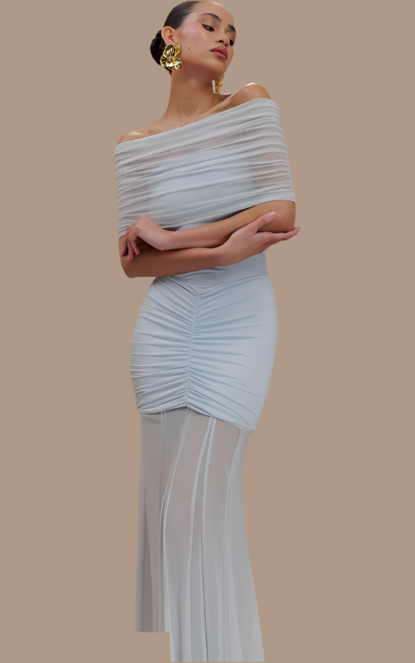 Step into enchanting Stardust Nights with the CASPIAN Slinky And Mesh Off Shoulder Maxi Dress, a captivating blend of allure and sophistication. Boasting a boat neckline and a strapless internal design with an elegant mesh overlay, this dress effortlessly combines glamour with a touch of drama. Ruching detail at the front and back waist enhances your silhouette, ensuring a flattering fit that's as comfortable as stylish. The flowing mesh skirt adds an ethereal charm, while the lined bodice provides comfort and coverage. Perfect for formal events or special occasions, the maxi length exudes grace and refinement, making it a standout choice for evenings filled with magical moments.