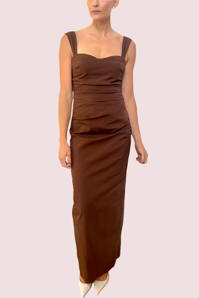 The Dahlia Balconette Gown in Chocolate Brown is a feminine and modern dress, ideal for any special occasion. It features wide straps, an underwire bustier detail, back split and tucks for a gathered finish through the body. Crafted from an Italian cotton fabrication offering ruching through the waist to ensure a flattering fit.