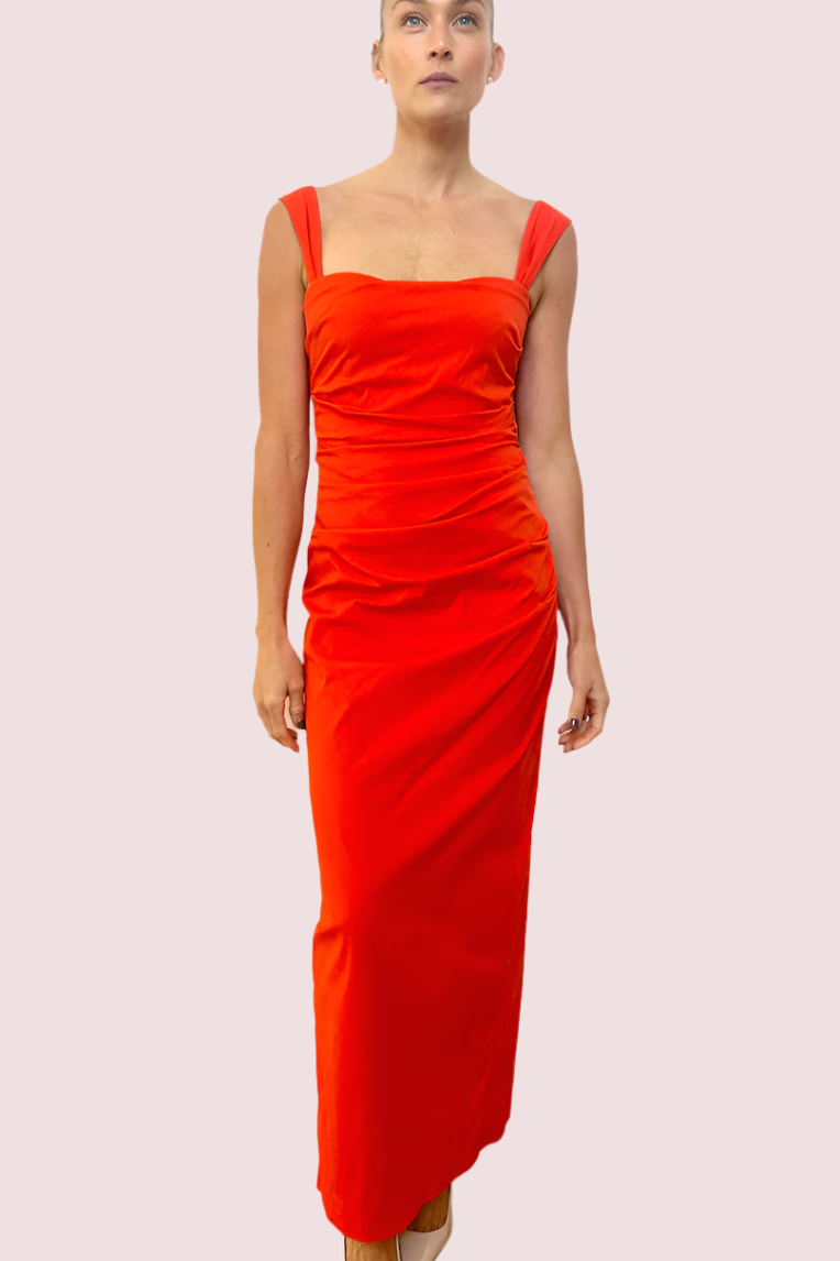 The Dahlia Balconette Gown in Tangerine is a feminine and modern dress, ideal for any special occasion. It features wide straps, an underwire bustier detail, back split and tucks for a gathered finish through the body. Crafted from an Italian cotton fabrication offering ruching through the waist to ensure a flattering fit.