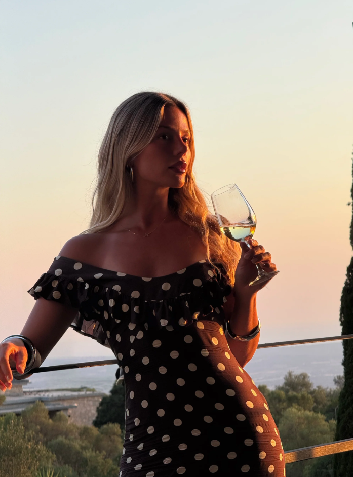A feminine maxi dress with a timeless polka dot pattern. The design features a flattering fit with delicate ruching details at the shoulders and an elegant open back that adds a modern twist. The delicate tie straps at the sides highlight the waist, creating a beautiful silhouette.