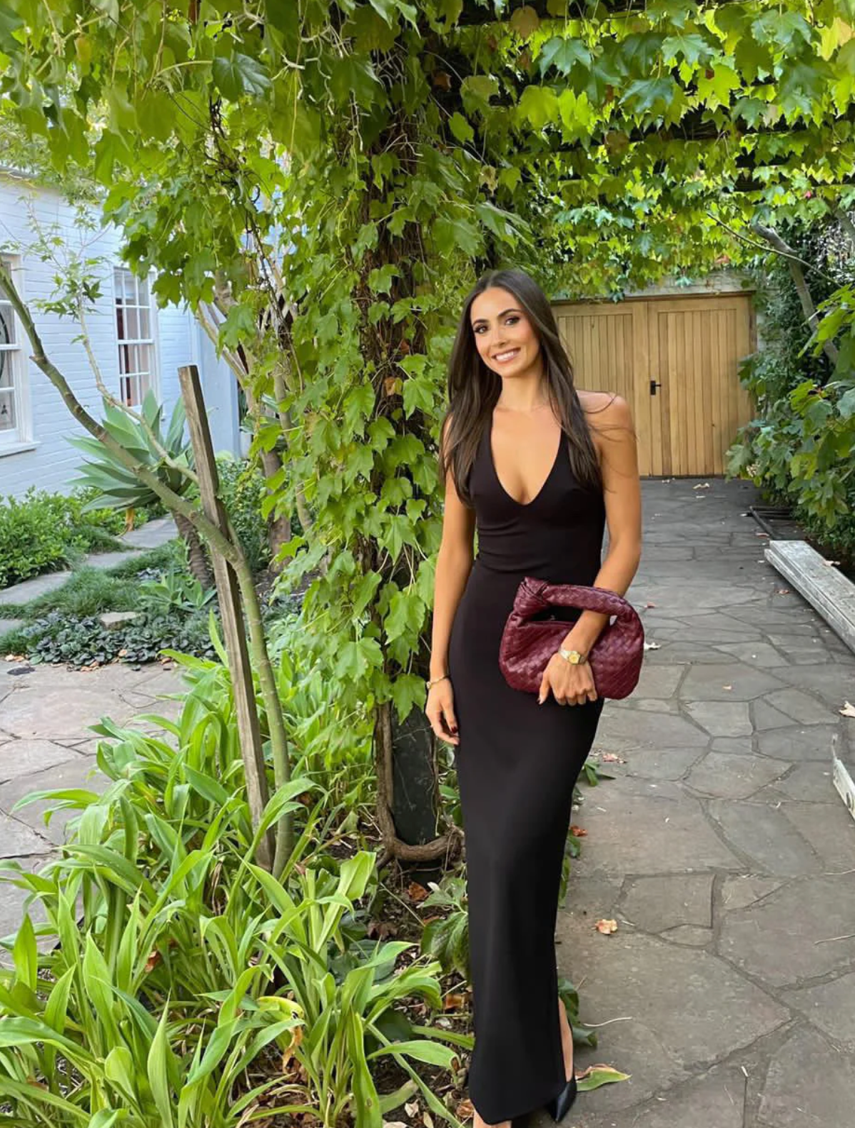 The 'Eiza' gown calls to mind minimalist styles from the '90s. It's made from lustrous cherry red stretch crepe and has an almond shaped neckline that'll work with a tennis chain, choker or dainty pendant. Just add barely-there heels and a clutch.