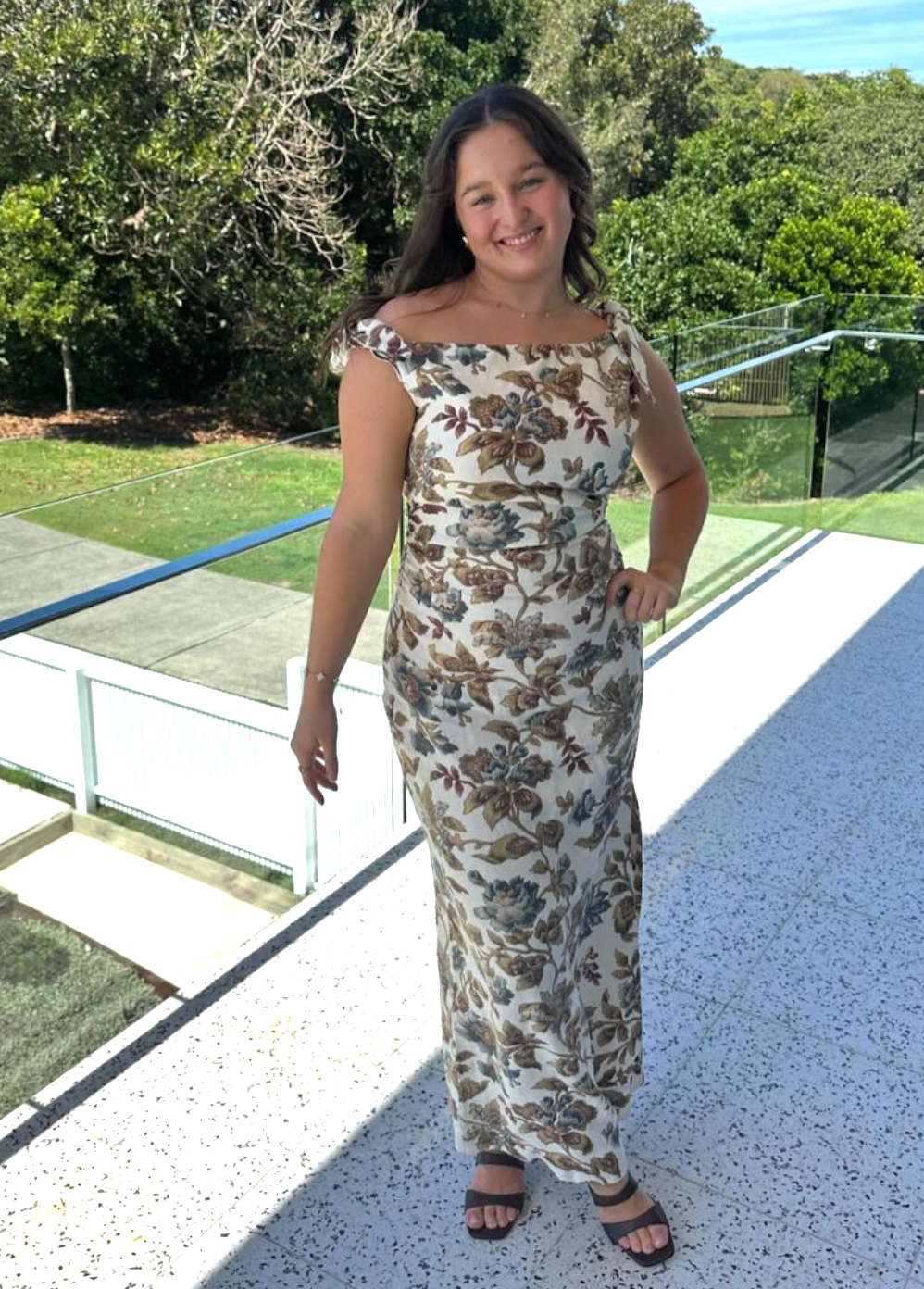 The Eleanora Tie Shoulder Dress is a repeat of our best selling Bettina Off Shoulder Dress. Crafted from a linen fabric in the SIR exclusive Viola print, drawing inspiration from palazzo wallpapers and intricate filigree florals. Featuring ruching through the waist for a flattering look, a side split and tie detail at the shoulder.