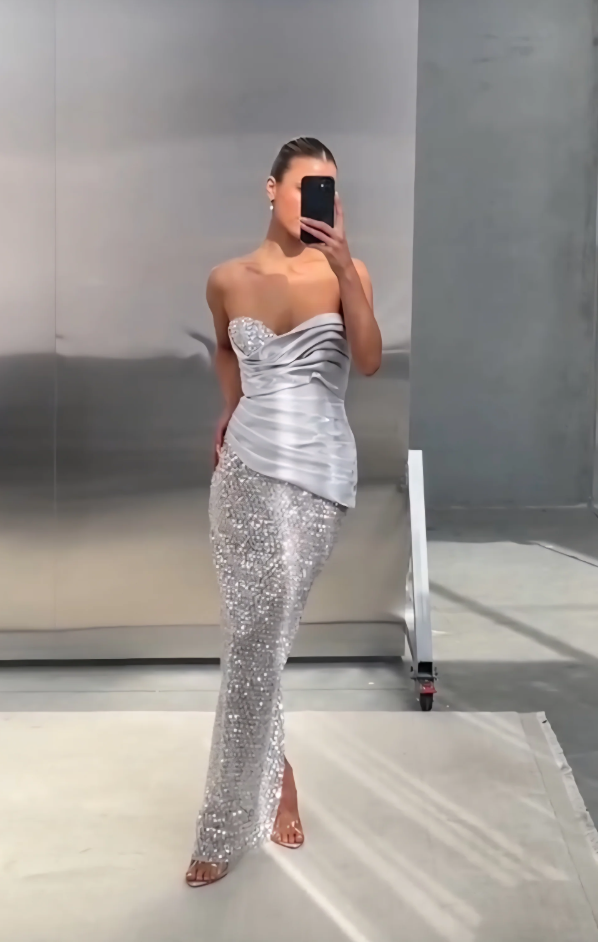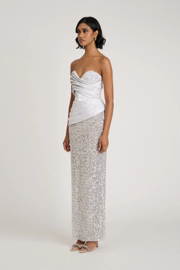 The structured silver satin bodice features organic folds for a sculpted, flattering silhouette, while the floor-length skirt is crafted from shimmering embellished silver sequin mesh for maximum impact. Padded cups and underwire provide comfortable support, and a centre-back split adds a sleek, modern finish.