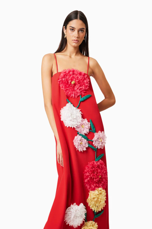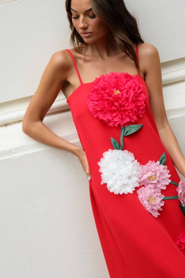 The Buttercup Maxi Dress in Red is a stunning addition to any wardrobe, combining elegance with a touch of playful charm. This flower-embellished maxi dress features vibrant, multi-colour 3D flowers, carefully embroidered across the fabric, adding a bold yet delicate pop of colour to the rich red base.