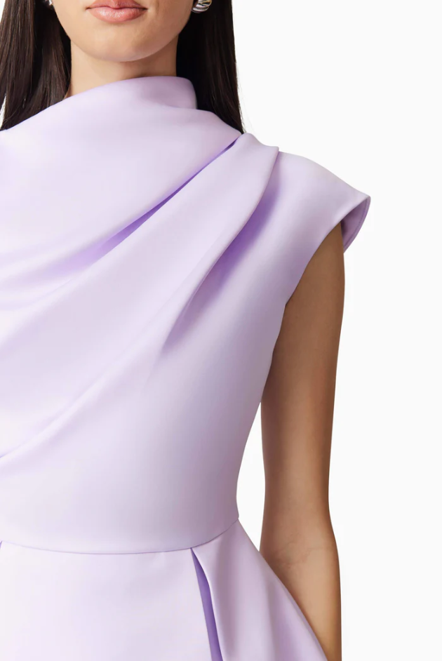 The Marissa Mini Dress in Purple is a luxe duchess satin tulip dress featuring an asymmetrical pleated neckline, tulip skirt, and invisible back zipper. Fully lined for a smooth fit, it offers a chic, feminine silhouette perfect for formal events, parties, or special occasions.
