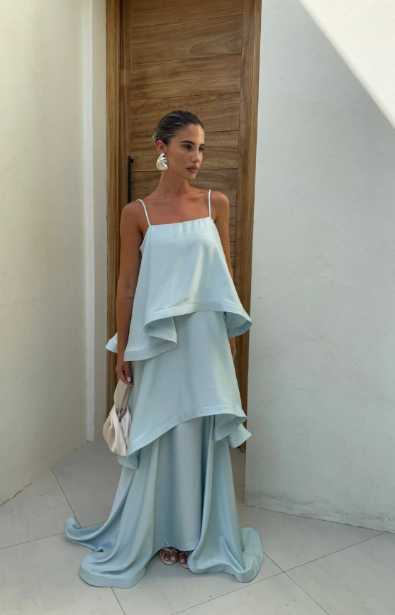 Delicate adjustable straps allow for a custom neckline fit, while the tiered skirt adds dynamic movement and visual depth. The soft blue hue feels fresh and seasonless, making it perfect for beach escapes, garden parties, or casual weekend outings.