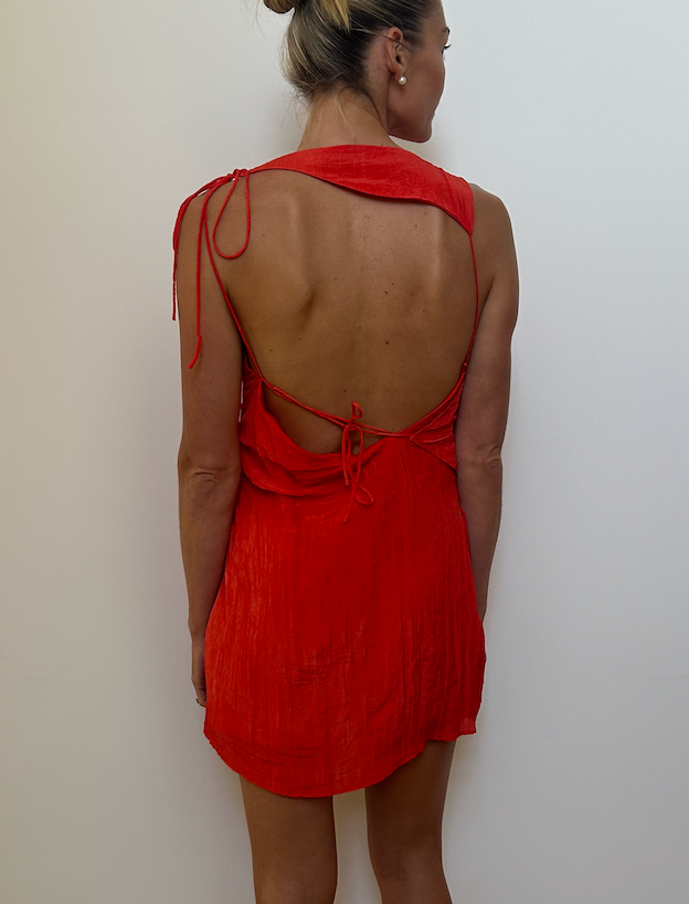 The Ligera Mini Dress in Tangerine is a sleeveless silhouette crafted from a lightweight crinkle satin fabrication with a lustrous finish. It features an asymmetric neckline with ties at the shoulder, a statement back cutout and soft ruching through the waist.