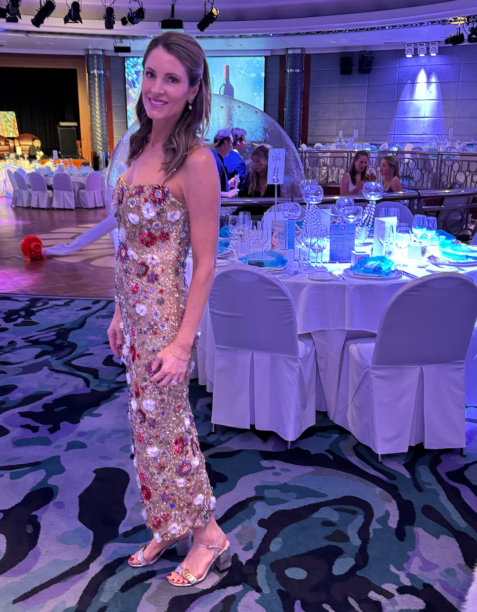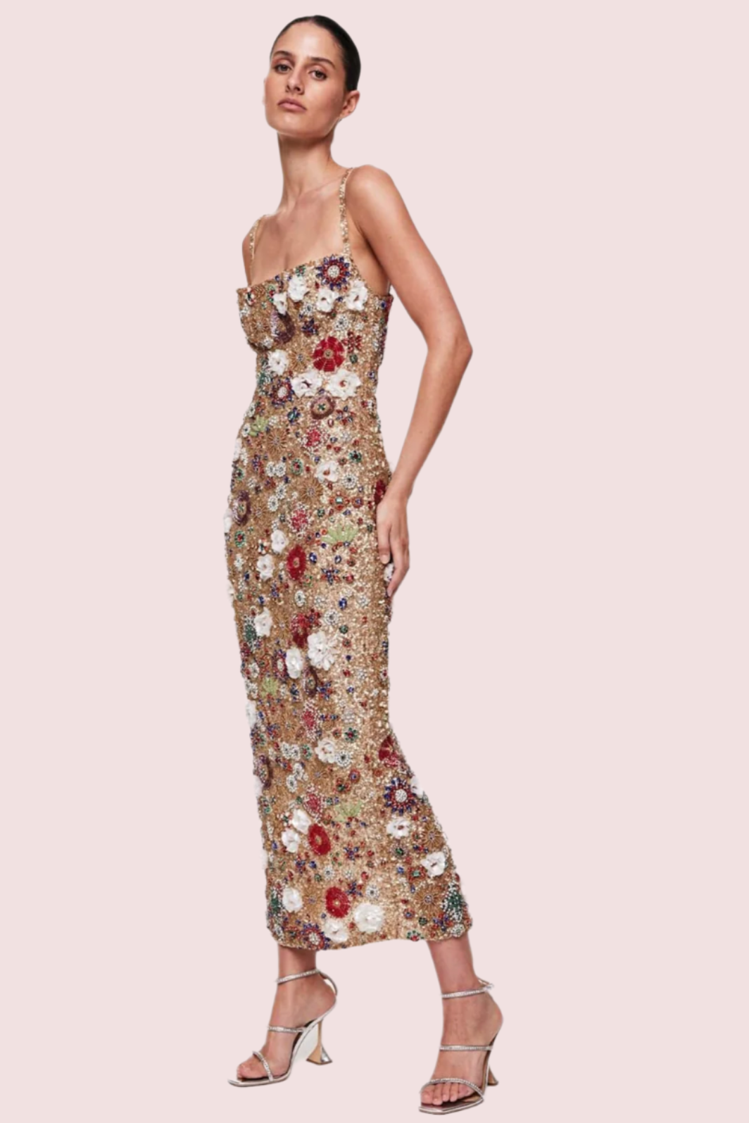 An all glamour silhouette, saturated in signature Rachel Gilbert heavy beading cut to a figure flattering shape with dainty straps.