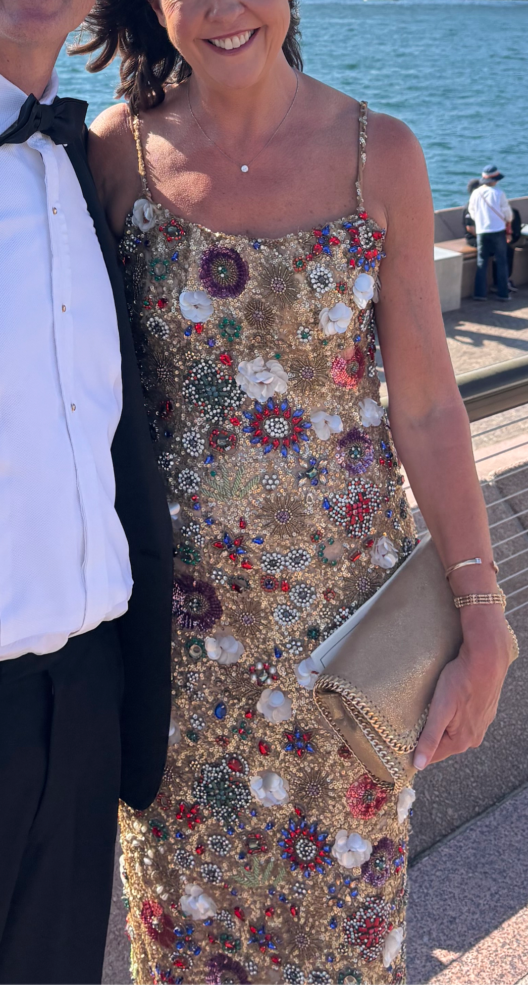 Please note due to delicate nature of fabric beads have fallen off the garment and must be taken into consideration when hiring. Aside from the model image, all photos shown are of this actual dress being worn with the current beading situation. This is a very intricately beaded dress with thousands of beads so the impact will still be there however it is not in brand new condition. Extra caution needs to be taken when wearing this garment and packaging this garment to send back due to its delicate nature.