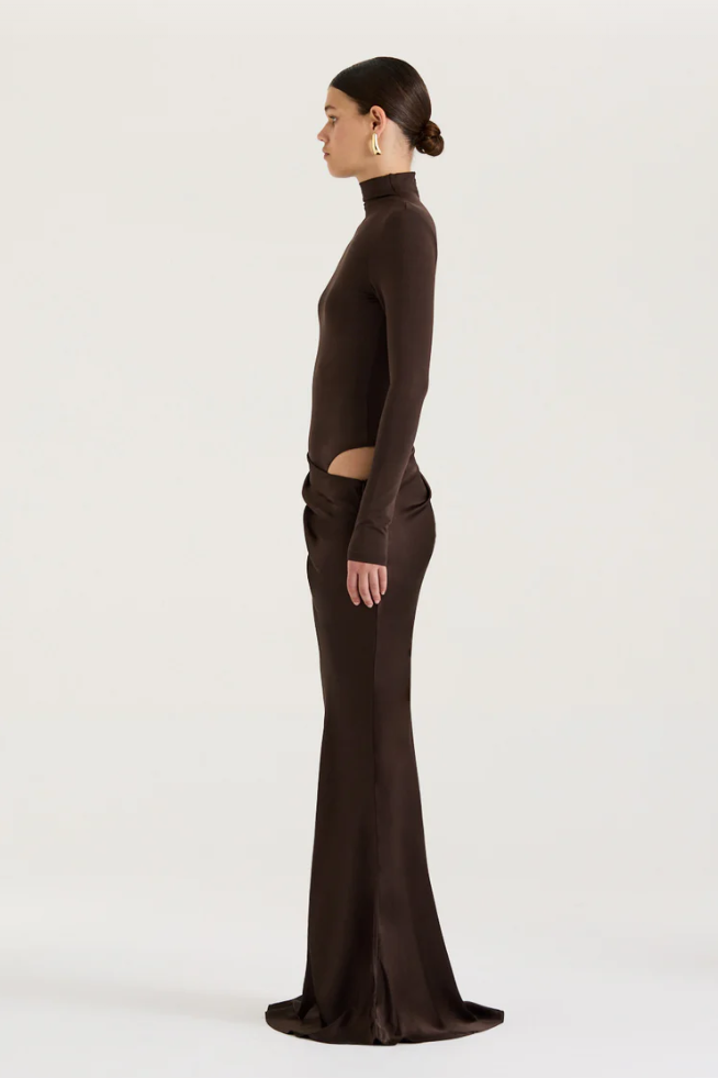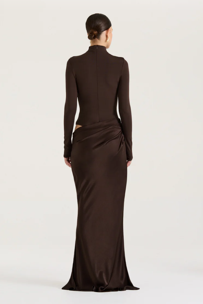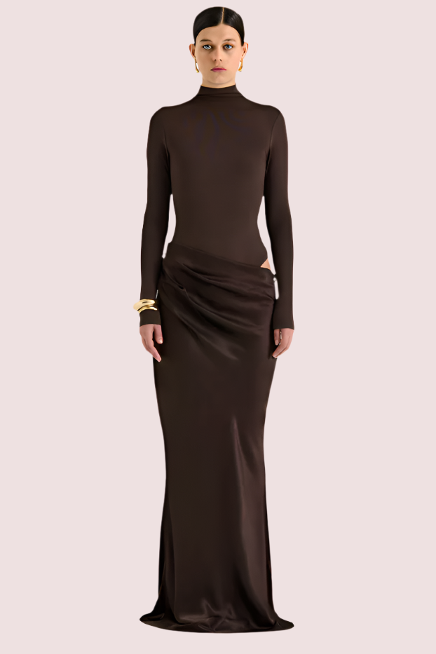 Rediscover our favourite Soraia Dress in a new long sleeve silhouette - Combining timeless modernity with classical draping, we introduce the Soraia Dress Chocolate. Crafted from two juxtaposing styles, Soraia features a form-fitting bodysuit and is complete with a soft satin-like maxi skirt that is detachable to wear separately.