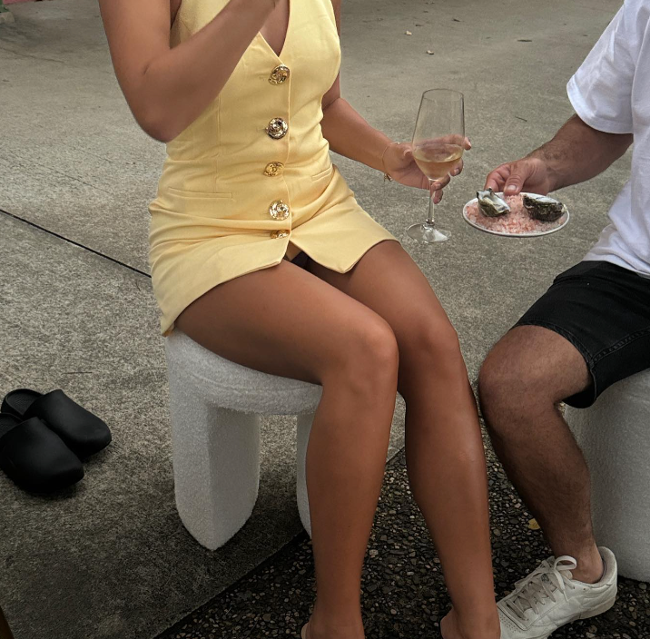 The Irida Vest Dress is the perfect day to night mini. A halter neck style vest dress, with custom made swirl gold buttons to add a little Wolf Gang flair.