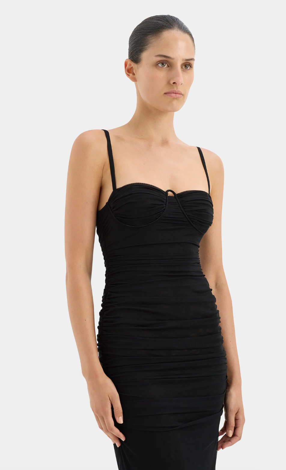 The Jacques Gathered Midi Dress in slate grey is a fitted dress crafted from an alluring mesh fabric. Featuring underwire bra cups, adjustable shoulder straps, and ruched detail throughout for a flattering silhouette. Finished with a slightly sheer hem, pair back with heels for your next special occasion.