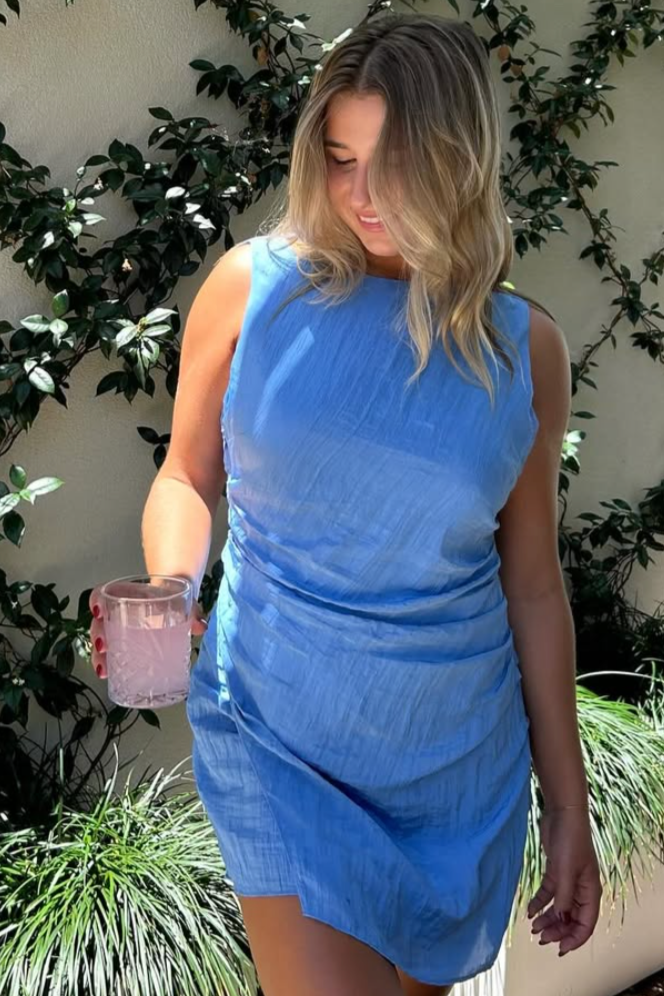 The Ligera Mini Dress in Blue is a sleeveless silhouette crafted from a lightweight crinkle satin fabrication with a lustrous finish. It features an asymmetric neckline with ties at the shoulder, a statement back cutout and soft ruching through the waist.