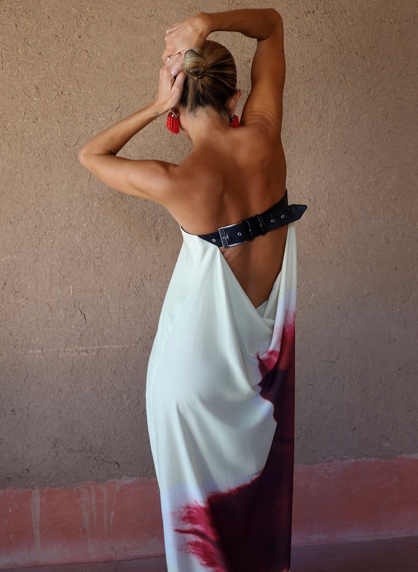 Antheia’s tough-girl leather belt strap, loose silhouette and the hot colours of the orchid print are the ultimate play on masculine/ feminine duality. Sleek, tough, sexy.