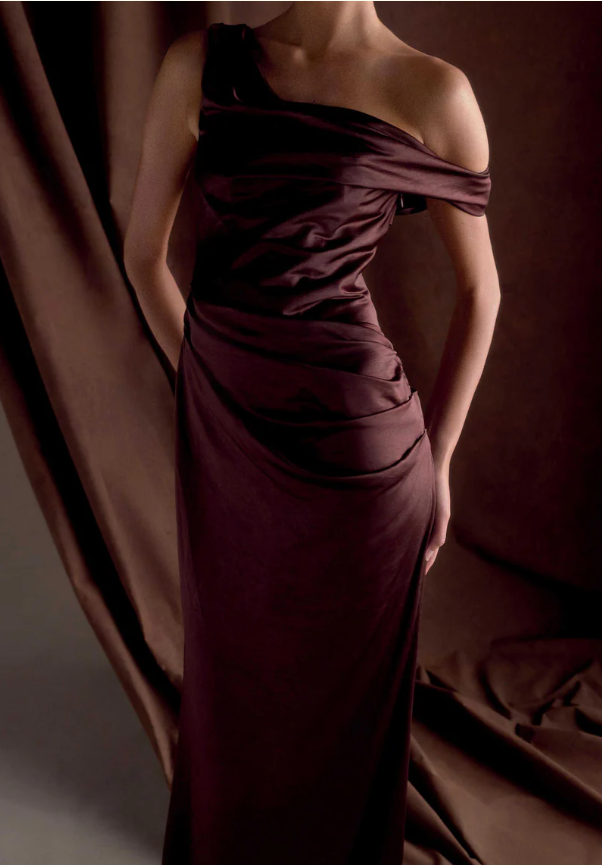 Meshki Dalia Off Shoulder Satin Dress Chocolate Brown Size 8
