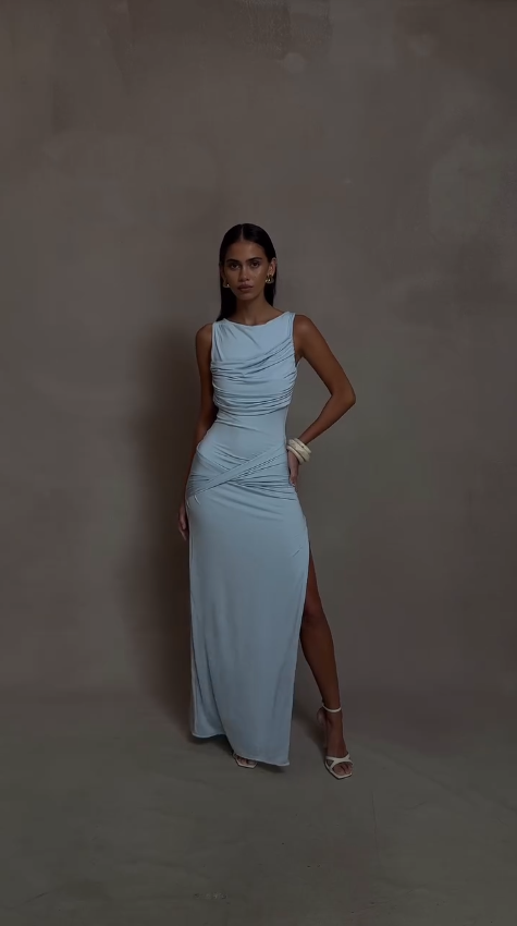 The HENLEY Slinky Drape Maxi Dress is a masterclass in understated glamour. Featuring a refined boat neckline, this bodycon silhouette drapes effortlessly across the bust and waist, creating a fluid, sculptural effect. The open-back design, secured with a delicate button closure at the top, adds a touch of allure, while a draped tie cascades elegantly from the right shoulder for a striking finish. Unlined for a lightweight, slinky feel, this dress is the perfect choice for evening sophistication, black-tie affairs, or modern bridal moments.