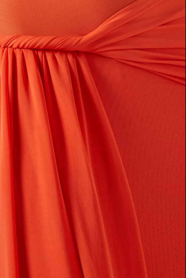 Mesh fabrication that plays with the idea of illusion. The garment boasts an asymmetric neckline with twist detailing on the shoulder, arm and hip. Waterfall sash detail cascades into the skirt allowing for a great sense of movement.