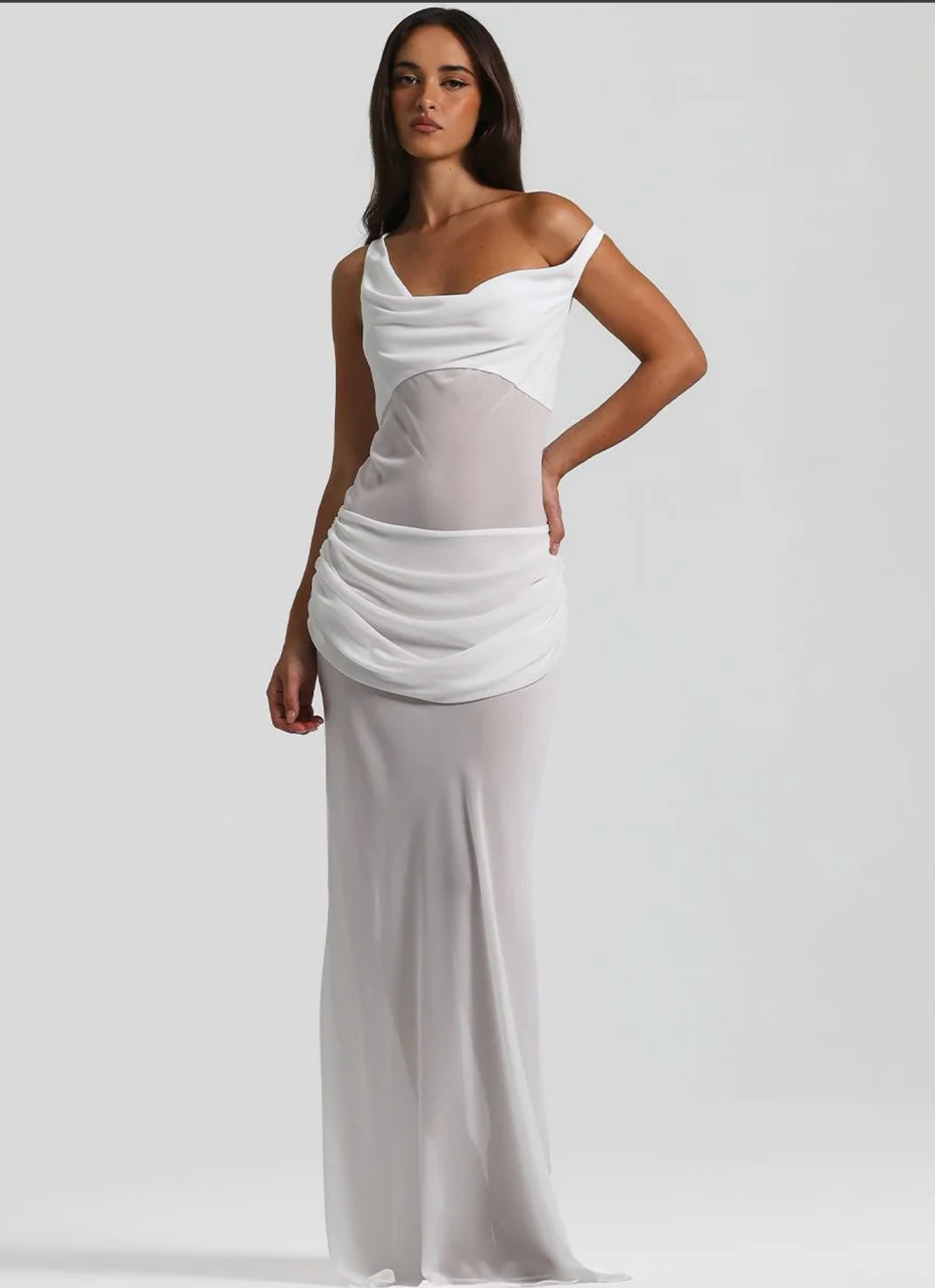 A silhouette of soft draping, refined through sculpting details. Please note a silk underlay has been added to the skirt so that the bottom isnt as see through.