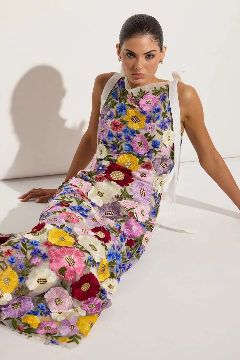 The statement silhouette of the season, the Nya Dress focuses on craftsmanship, featuring hand embroidered florals across a Midi length silhouette. Complete with shoestring shoulder straps. This style is sold with a slip.