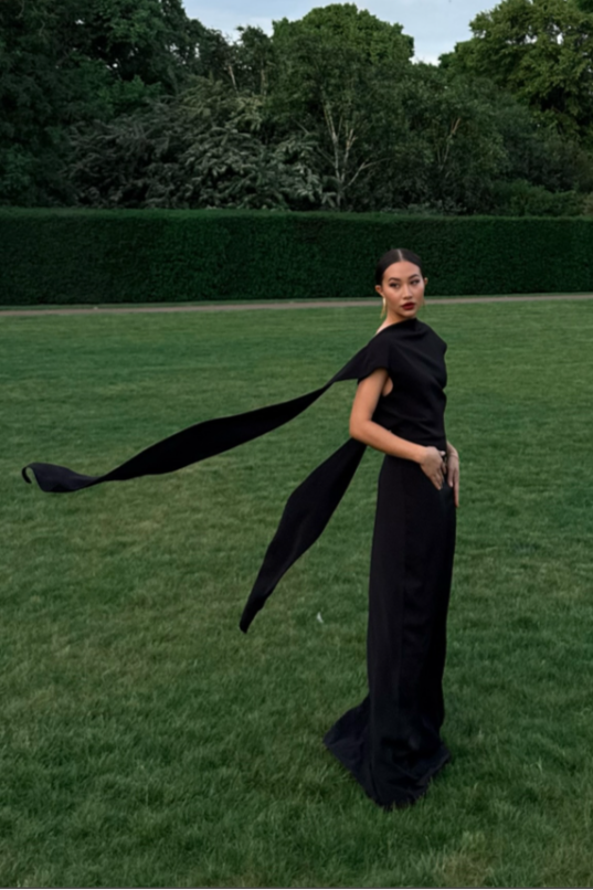 If elegance was a dress, she would be it muses. Adorned with delicately draped shoulders that lead into an open low cut back and creates a sophisticated high cowl neckline to complete this flattering party favourite, where simplicity creates opulence.