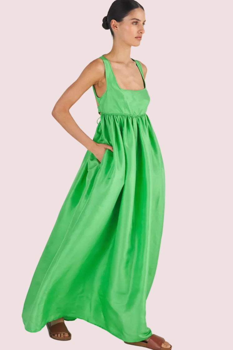 The Oroton Strappy Sun Dress is tailored from pure silk complemented by a vibrant green colouration which enhances the natural lustre. This style features a flattering fitted-through bodice that falls into a voluminous gathered skirt. .
