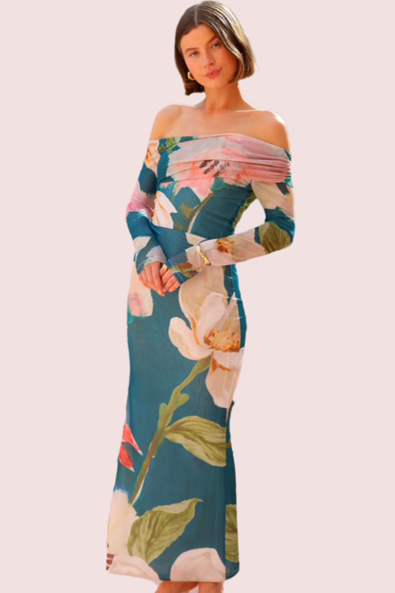 Add a pop of print with the By Nicola Paloma Off Shoulder Mesh Maxi Dress in Pine Green