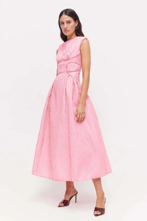 The Rachel Gilbert Celia Dress in Orchid features a midi-length A-line design with a high neck and intricate bodice detailing, adding depth and dimension to the garment. The waist cinches in, while the voluminous skirt flatters the female form, offering a contemporary twist on the brand's signature silhouettes.