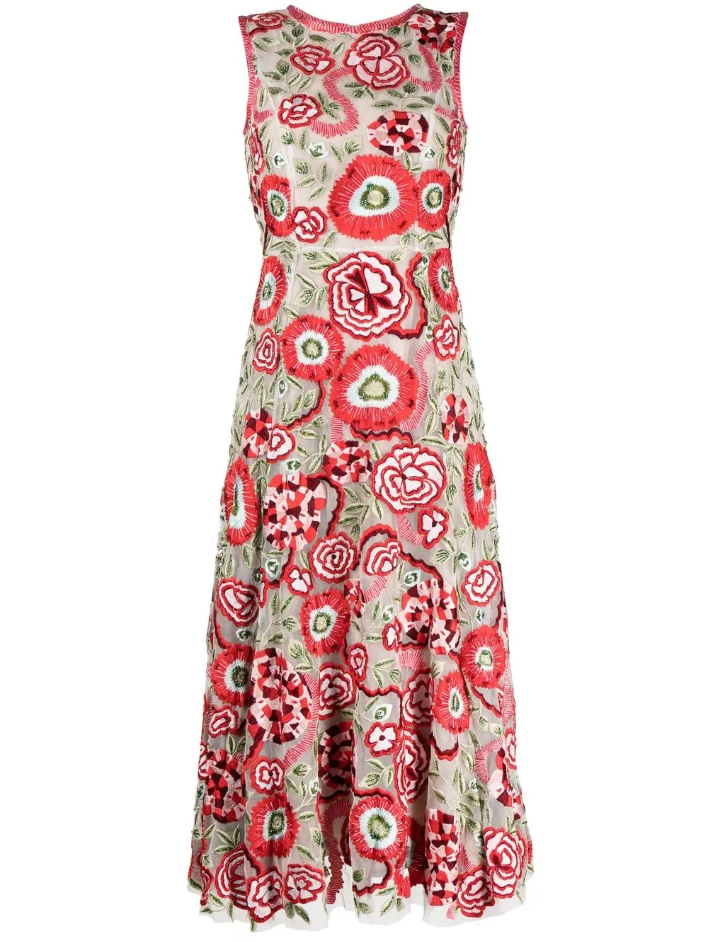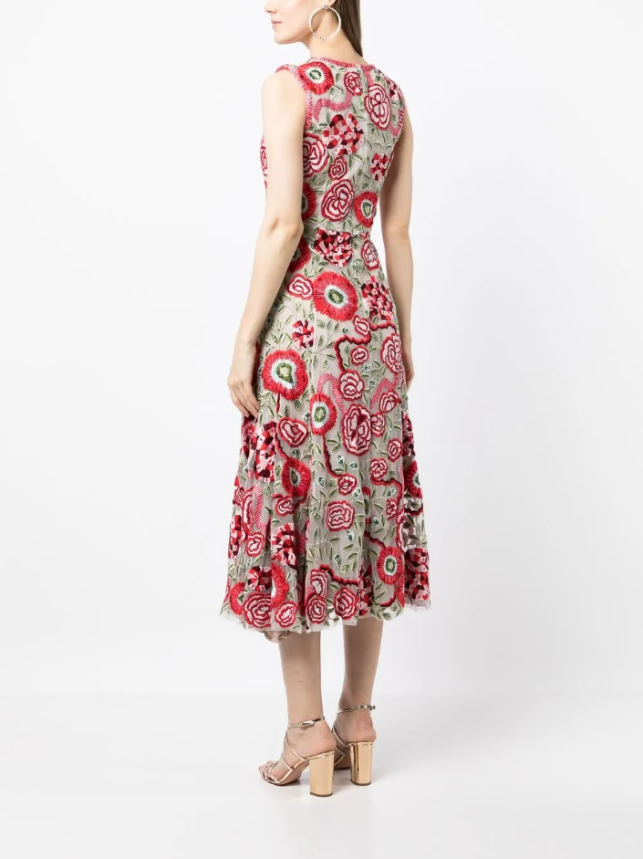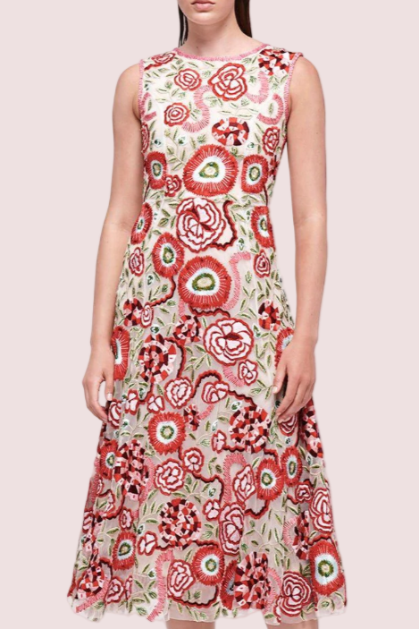 Red/Multicolour all-over floral embroidery tulle overlay flared skirt scoop neck sleeveless concealed rear zip fastening.