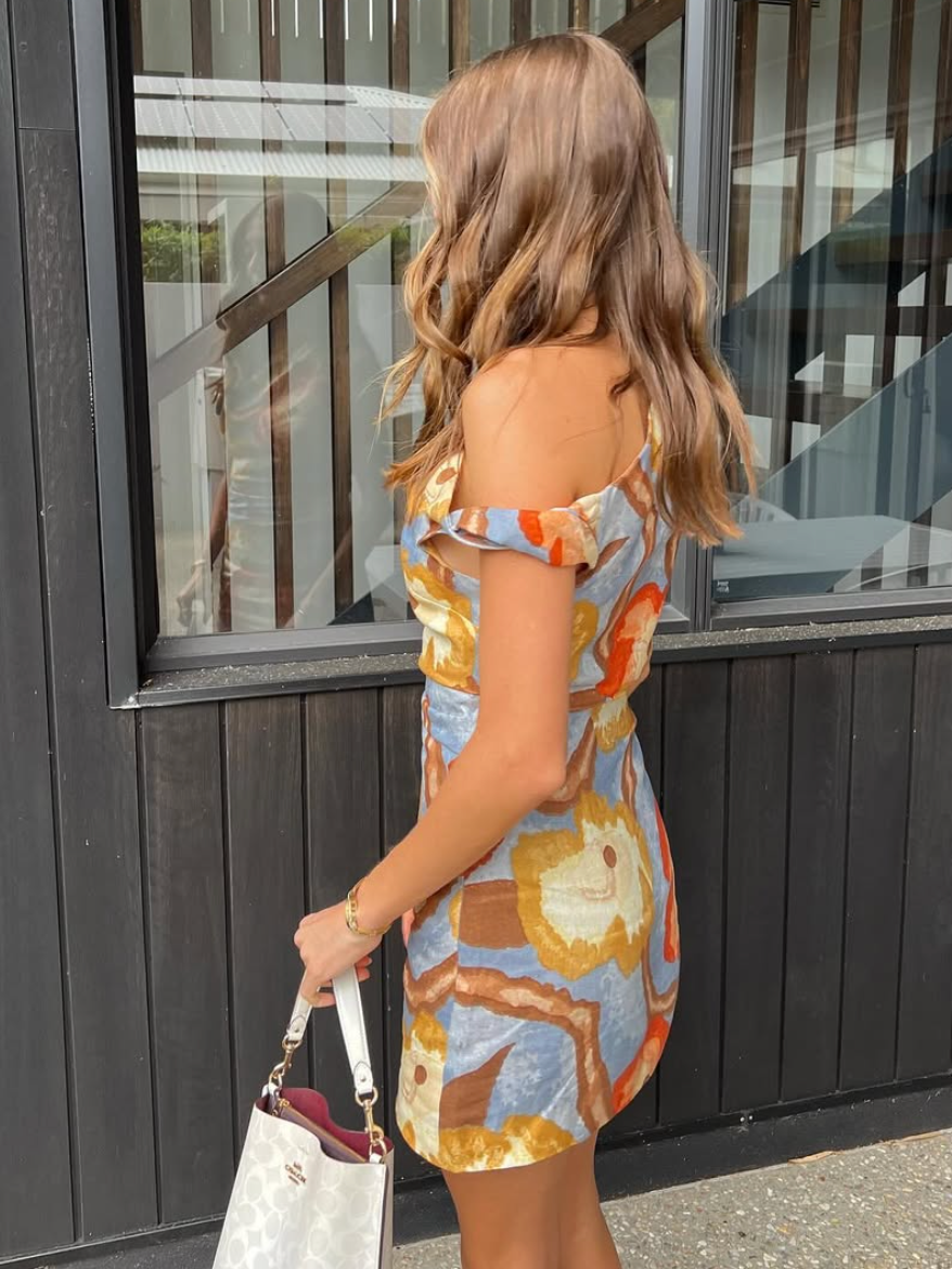 The Avery Twist Mini Dress is a feminine silhouette cut from our signature midweight linen, in an exclusive SIR. print inspired by ditsy 1990s floral prints. It features an asymmetric neckline, a twisted off-the-shoulder strap and a softly tucked waist that gives way to a relaxed mini hem.