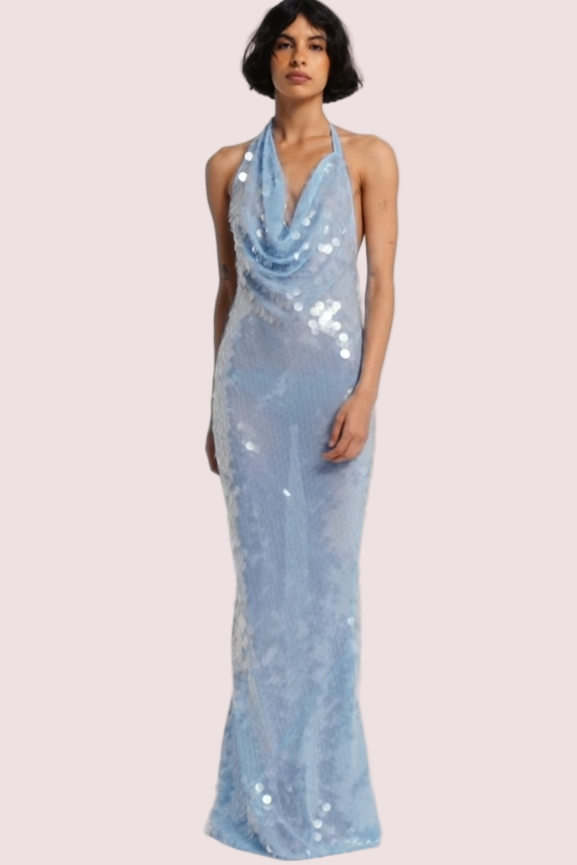Drenched in cornflower blue paillettes from neckline to hem, Anais shimmers and glistens like the sun on water. An adjustable cowl neckline and waist tie makes it easy to find your perfect fit.