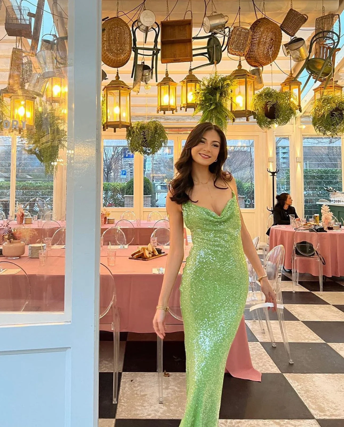 Made to mesmerise, Gaia turns a 90s slip into high-voltage glamour. Drenched in sequins that catch the light and in a fresh shade of green, it skims the body with a cowl neck, low back and barely-there straps.