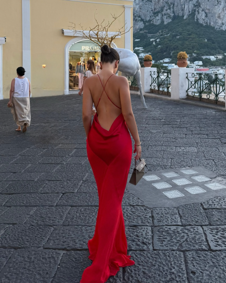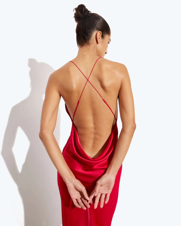 Timeless with a twist. Lotus is our clean and serene red slip dress with sheer diamond mesh panel and criss-cross back straps.