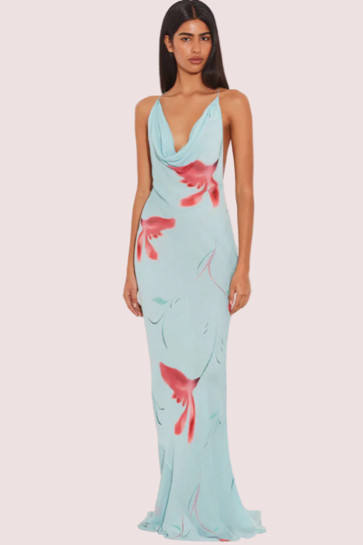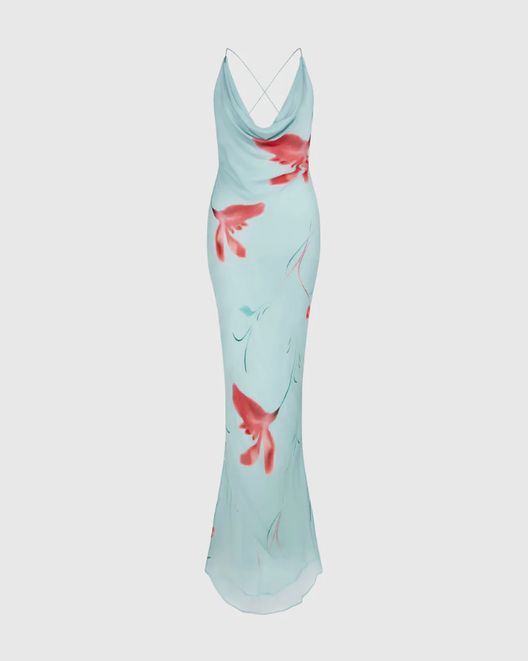 All eyes on Vincenza, our slinky floral maxi. With a signature cowl front, dramatic cross-back, and a floor-grazing train, Vincenza does beach or town in style.