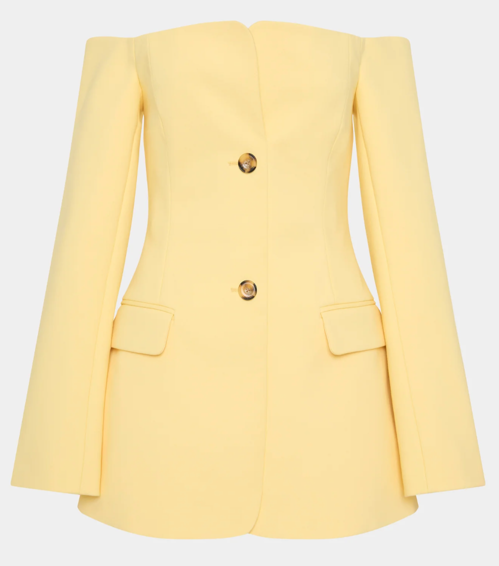 The Sandrine Tailored Mini Dress is an elevated silhouette, crafted from a premium Italian suiting fabric in a new season vibrant lemon hue. Inspired by the shape of a blazer, this style offers an off-shoulder fit with a single breasted design, punctuated waist, and front welt pockets. Featuring an internal corset to provide a structured look, pair yours with heels for your next special occasion.