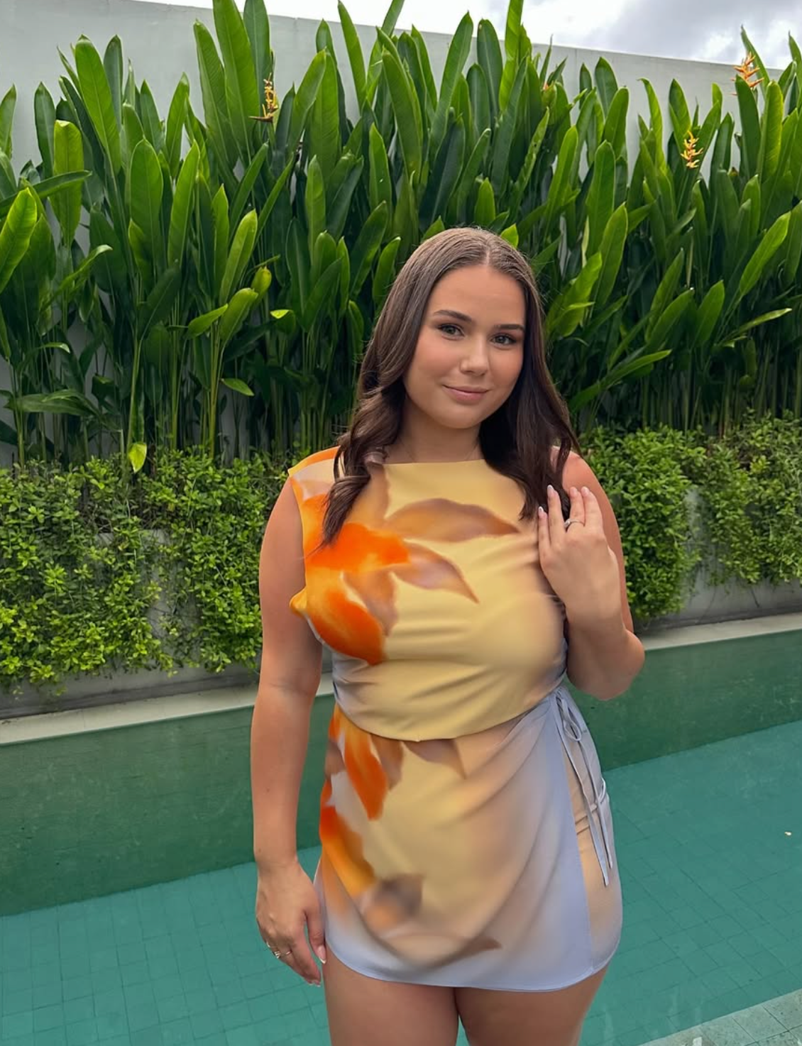 The Serene Mini Dress in Sequoia Floral is a sleeveless mini silhouette crafted from lightweight silk crepe, printed with large-scale florals and ombre borders uniquely placed on each garment. It features an asymmetric neckline with shoulder ties and a statement cutout at the back.