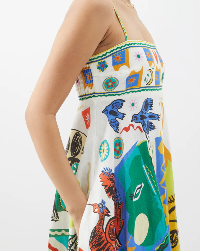 Crafted from a Linen fabrication, this midi length dress features a square neckline, fitted bodice and empire waist which falls into a free flowing full skirt that finishes at the ankles.