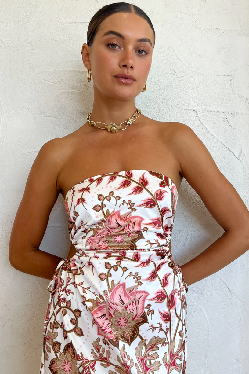 Crafted from a silky to touch fabrication, this maxi dress features a strapless neckline, fitted silhouette side waist cut outs and is finished with an alluring side split.