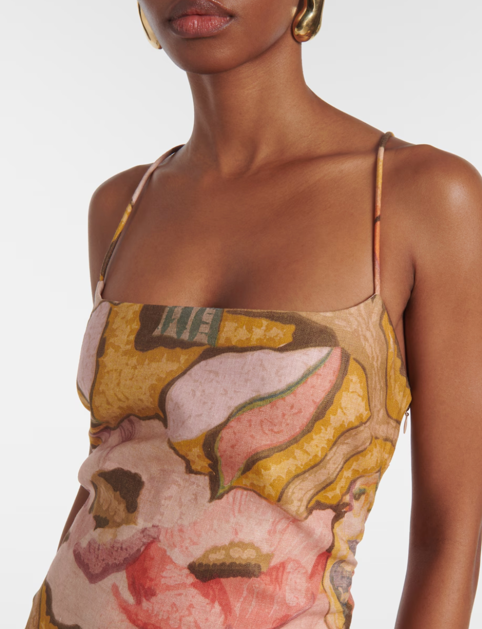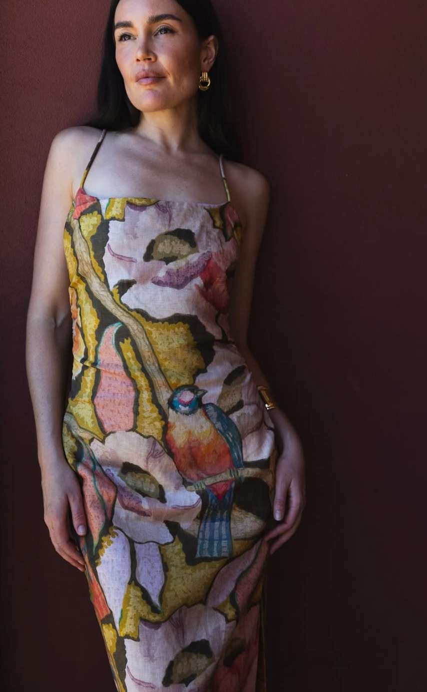 The Talulah Column Dress in Sanderling Floral is an event ready silhouette, crafted from midweight linen in a SIR. exclusive print showcasing camouflaged birds and painterly florals. Designed to be form-fitting, it features a straight neckline, tucks through the body for a gathered effect and slender corded straps.