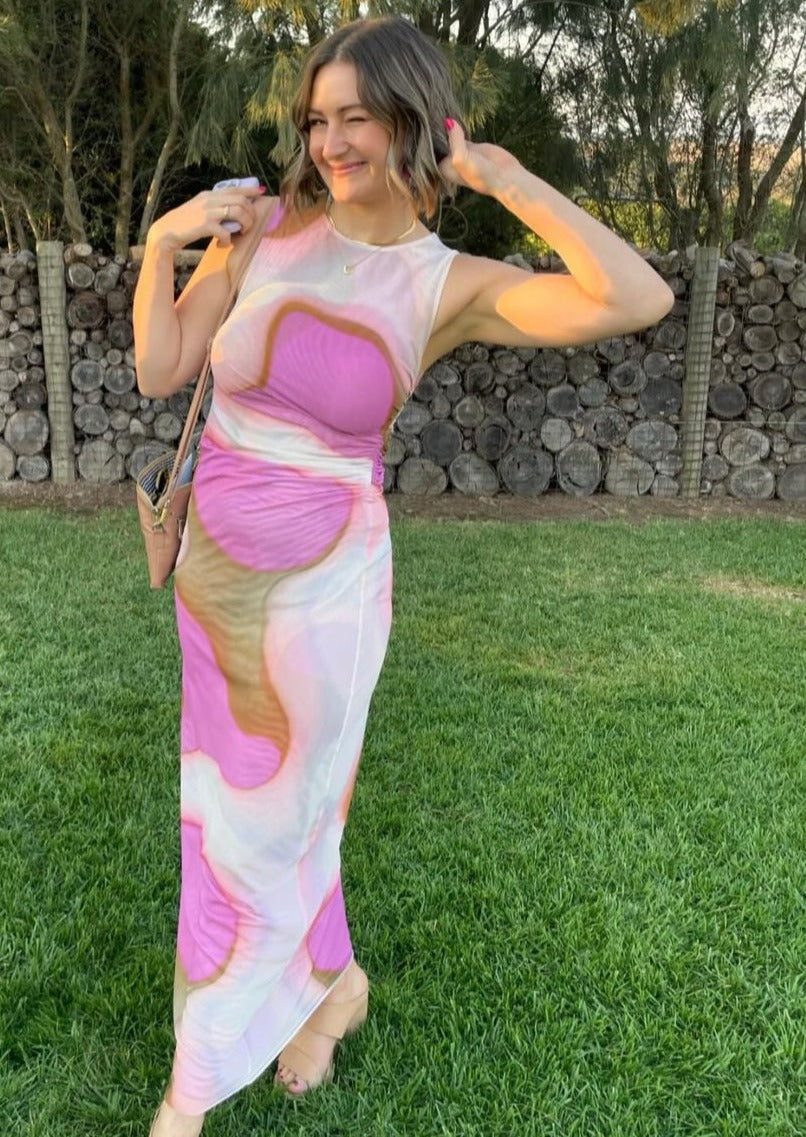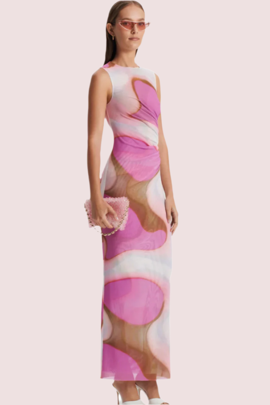 The Italian Watercolour Print Dress invites modern femininity to occasion silhouettes. Exclusively designed in-house as a hand-painted interpretation of watercolour illustrations, the abstract motif is carefully printed in our Italian atelier on a high-quality mesh fabrication. Crafted to a minimalist silhouette, the dress is defined by the asymmetrical, gathered detailing down the side of the waist for a flattering fit. Pair with minimalist accessories for upcoming events.