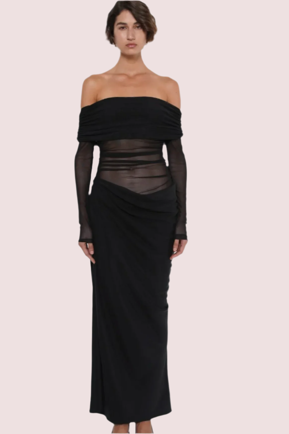The Yasmin Maxi Dress features a beautiful off-shoulder design with a flattering cowl on the wearers left side waist. The overlapping skirt adds a touch of sophistication while the mesh bodice. Perfect for any special occasion.